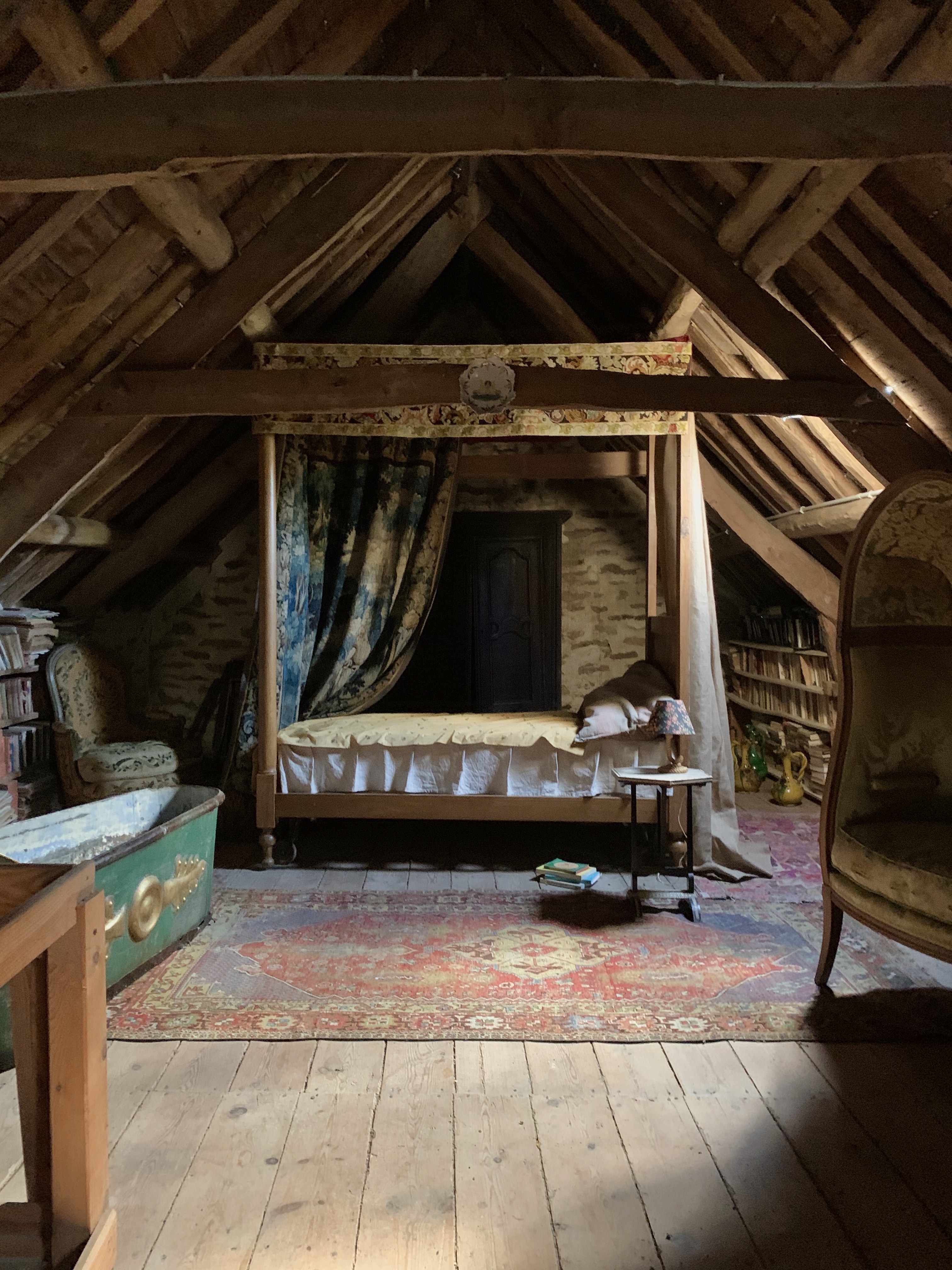 Above: The second floor is the attic, known as the reading room because it’s filled with books. The four poster is draped with an antique Aubusson tapestry—and, on occasion, is used by guests. The couple found the antique tôle bathtub at a brocante.