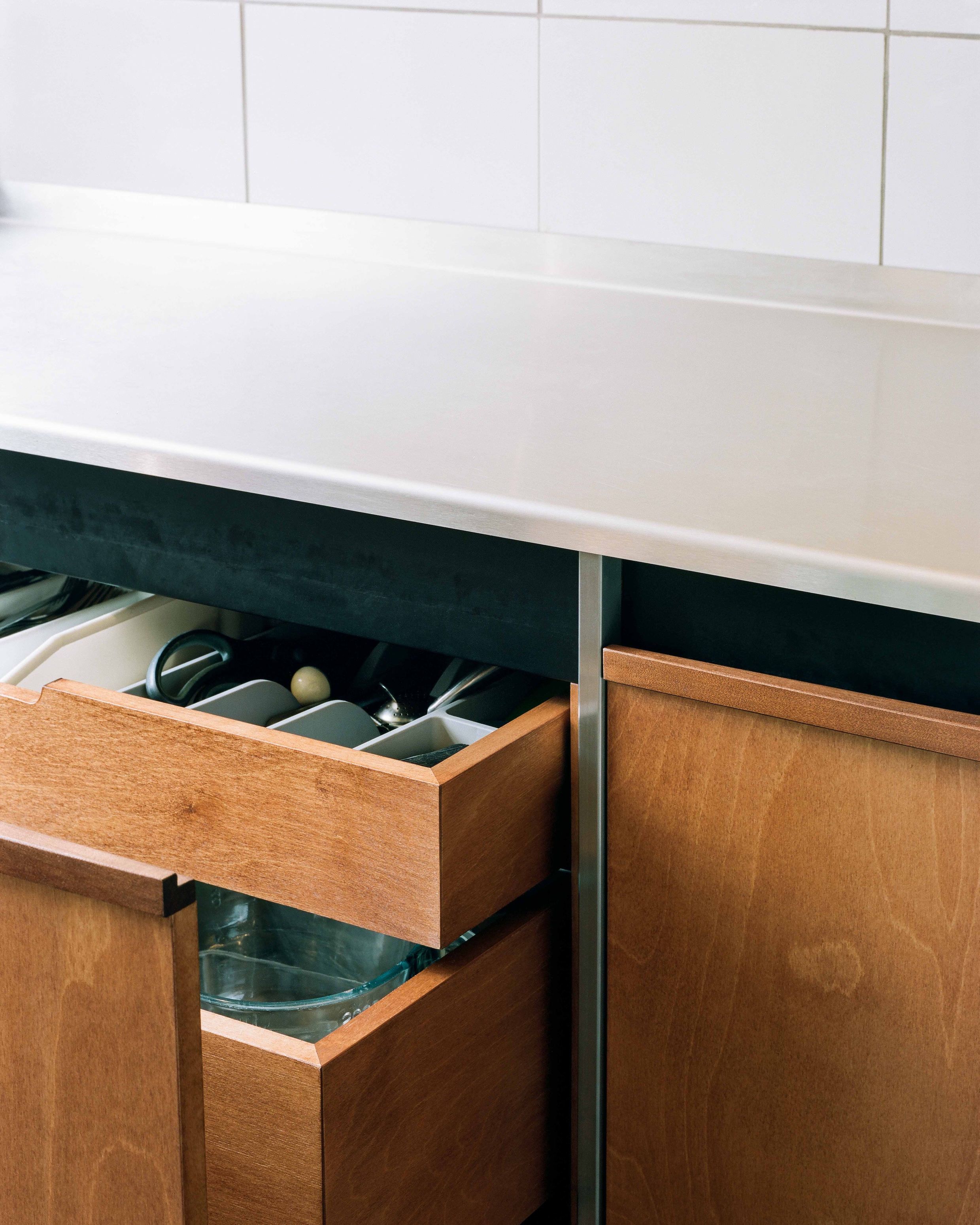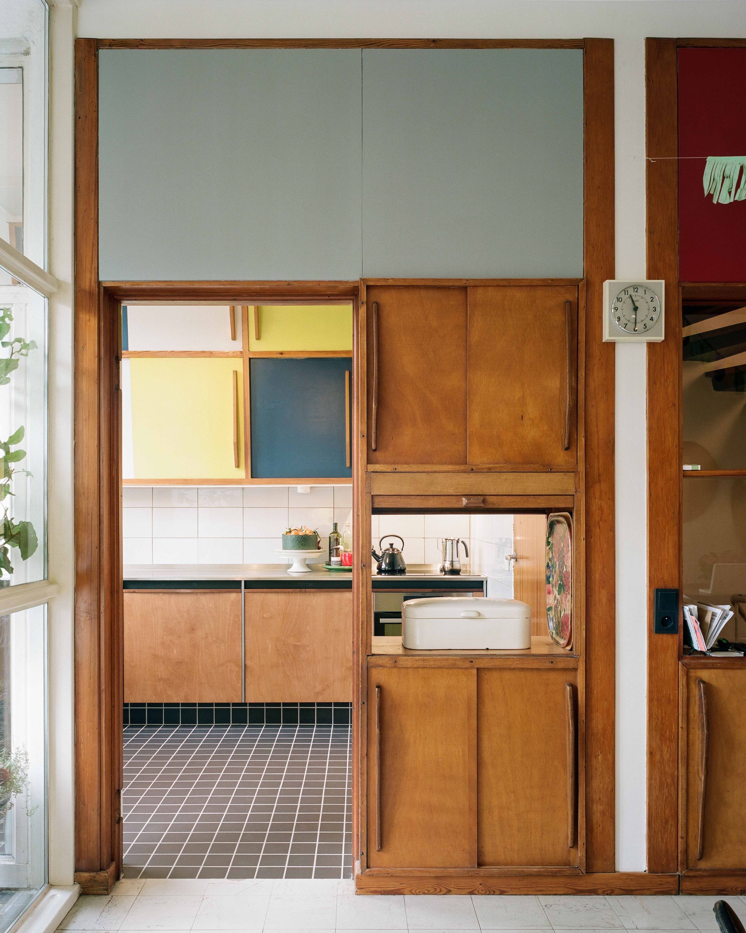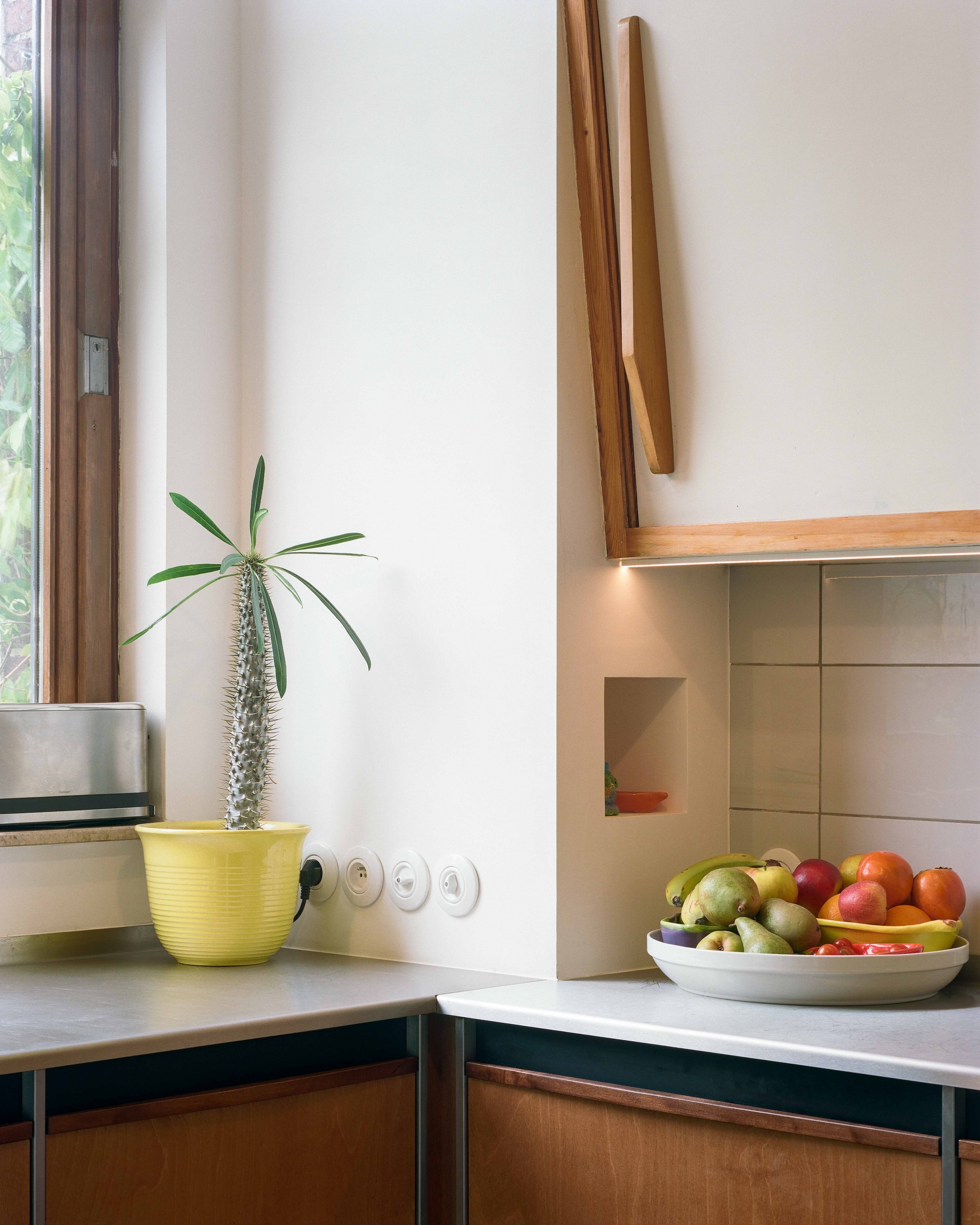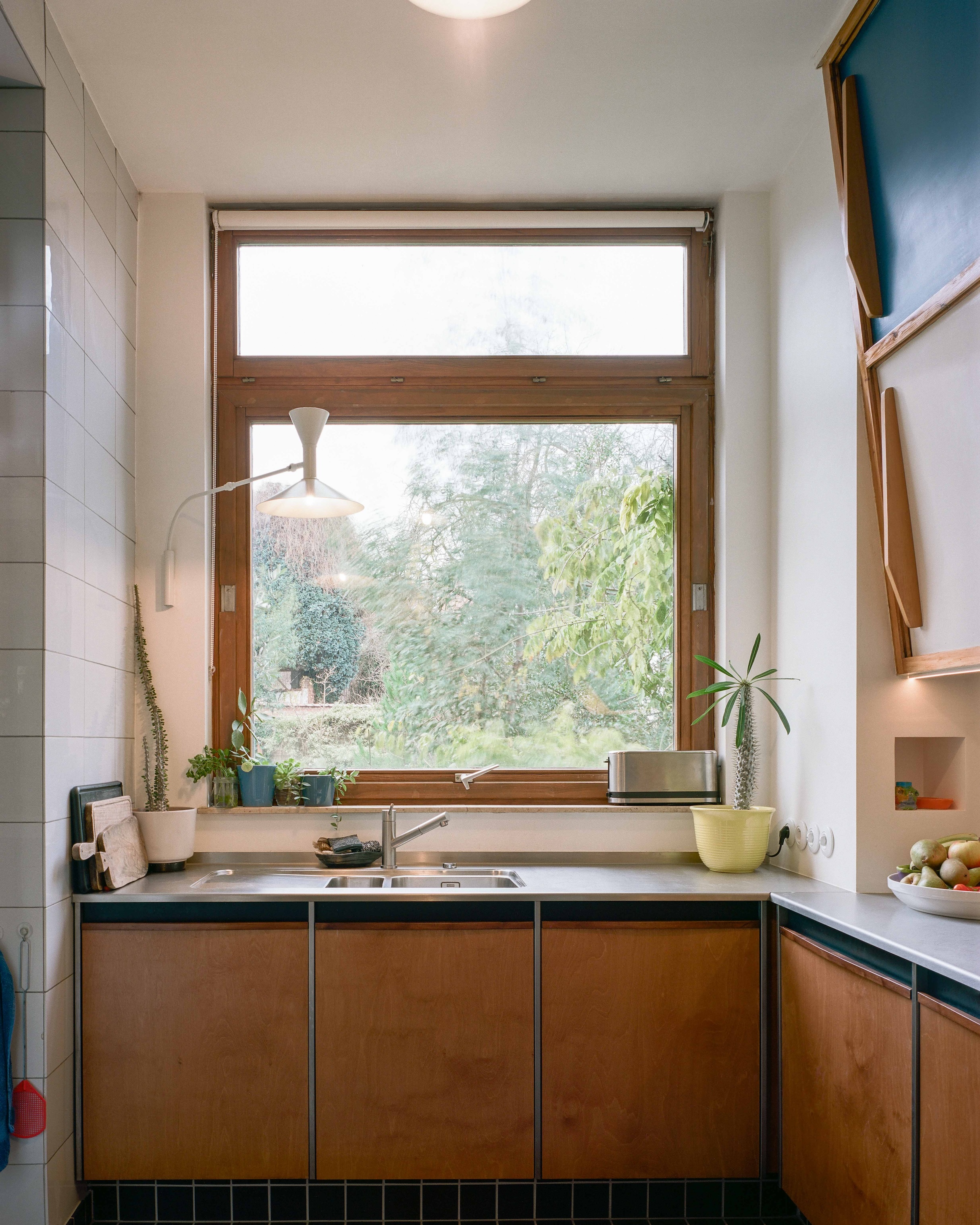 Van der Meeren, who is known for his use of bold blocks of color and considered one of Belgium’s greatest modernists, designed most of the furnishings, too. “So it was a total concept,” adds Francis. Except, of course, changes had been made over the years. Francis and Idalie–he’s a data scientist, she has a leather bag line—are only the third owners and were committed to recapturing their house’s original punch. Not surprisingly, the kitchen was the room most in need. The hitch was that they weren’t able to uncover plans or old photos, and any departures from the original state required permits.